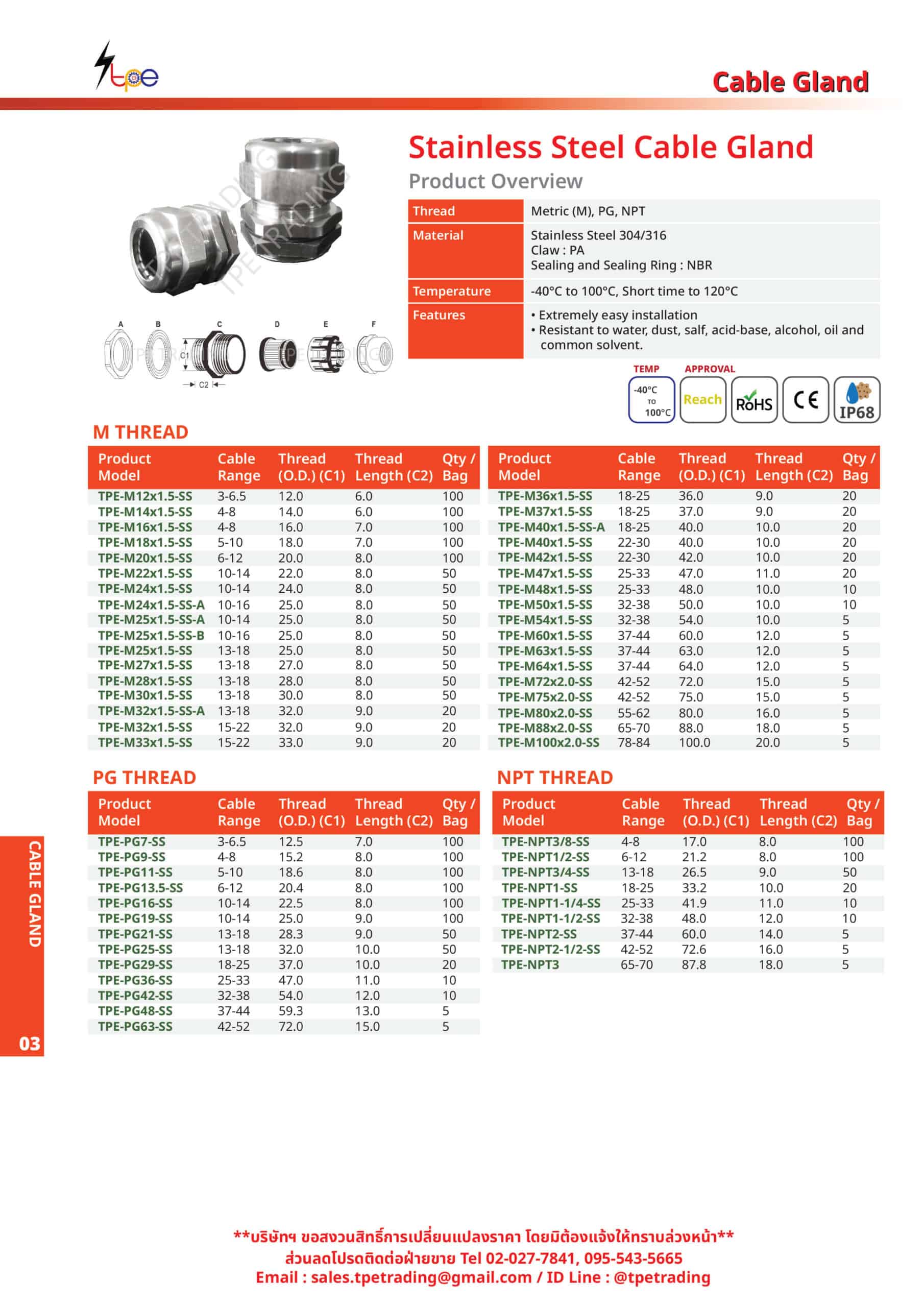 • ทนอุณภูมิได้ตั้งแต่ ต่ำสุด -40° C สูงสุด 120 ° C  มีให้เลือก 3 ชนิดเกลียว คือ เกลียว PG, M ( Metric ), NPT (นิ้ว) ครอบคลุมทุกขนาดสายไฟ