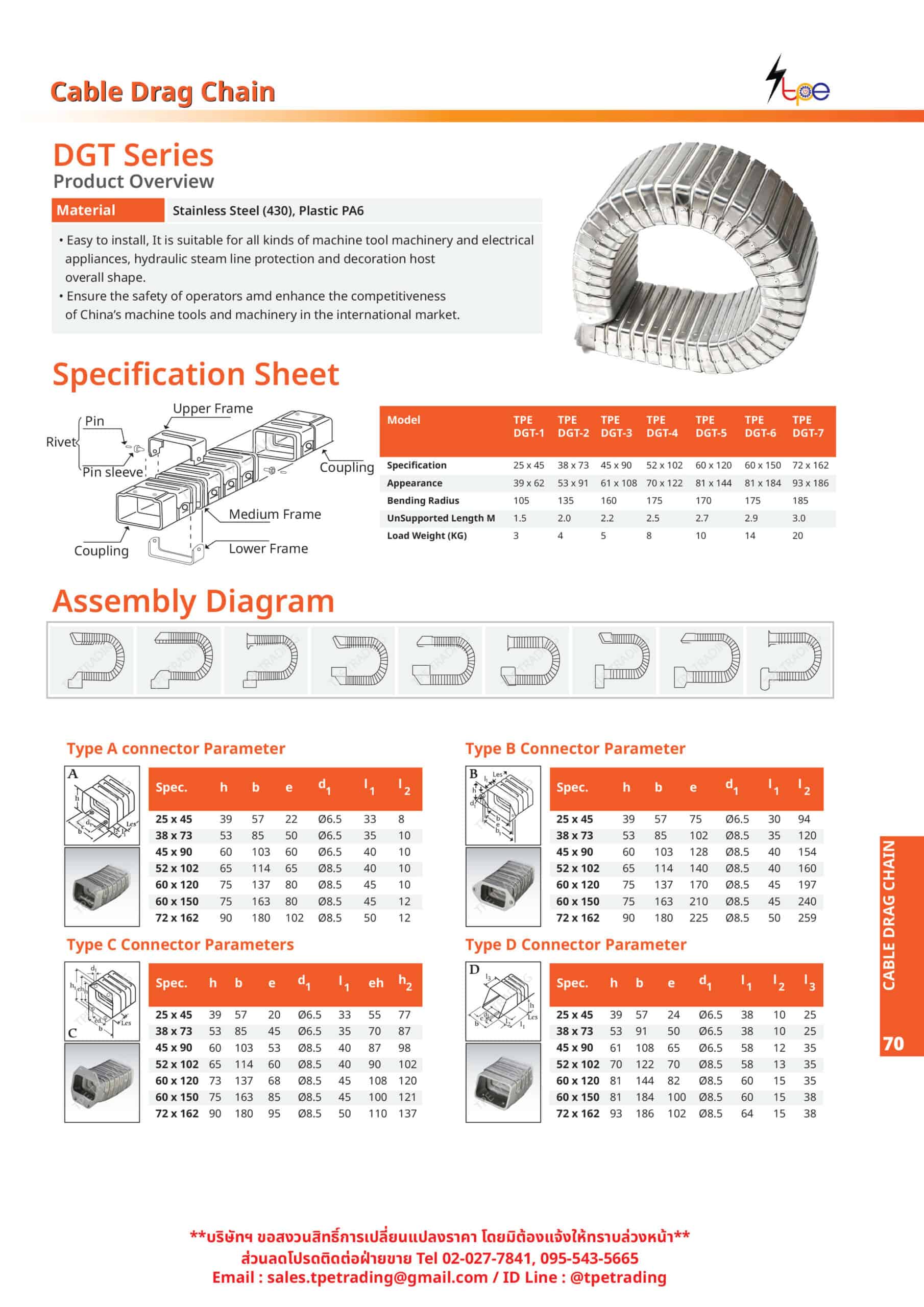 สำหรับรางกระดูกงูเหล็กรุ่น DGT เป็นอุปกรณ์ที่ใช้ติดตั้งกับเครื่องจักรที่มีการเคลื่อนไหว ซึ่งมีส่วนช่วยในการลดอุบัติเหตุที่อาจจะเกิดขึ้นกับการทำงาน และป้องกันสายไฟจากการหลุดออกจากตัวจุดที่ติดตั้ง และยังช่วยให้อายุการใช้งานของสายไฟให้มีอายุการใช้งานได้ยาวนานขึ้น