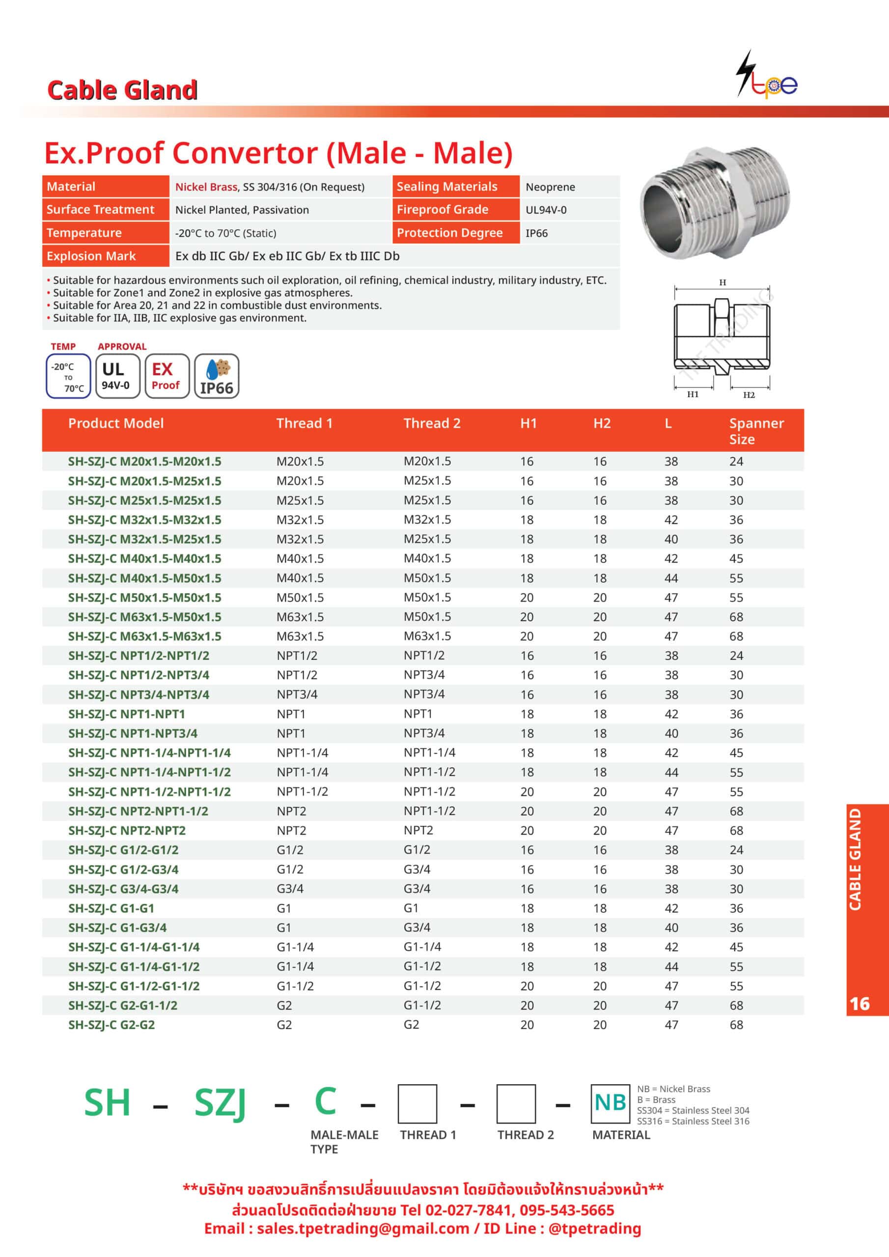 ตัวอย่าง SH-SZJ-D M16x1.5-M16x1.5-NB = Explosion Proof Adapter ชนิด ตัวลดเกลียว ใช้สำหรับเกลียว M16x1.5 และเกลียวอีกด้านขนาด M16x1.5 ใช้วัสดุ ทองเหลืองชุบนิกเกิล