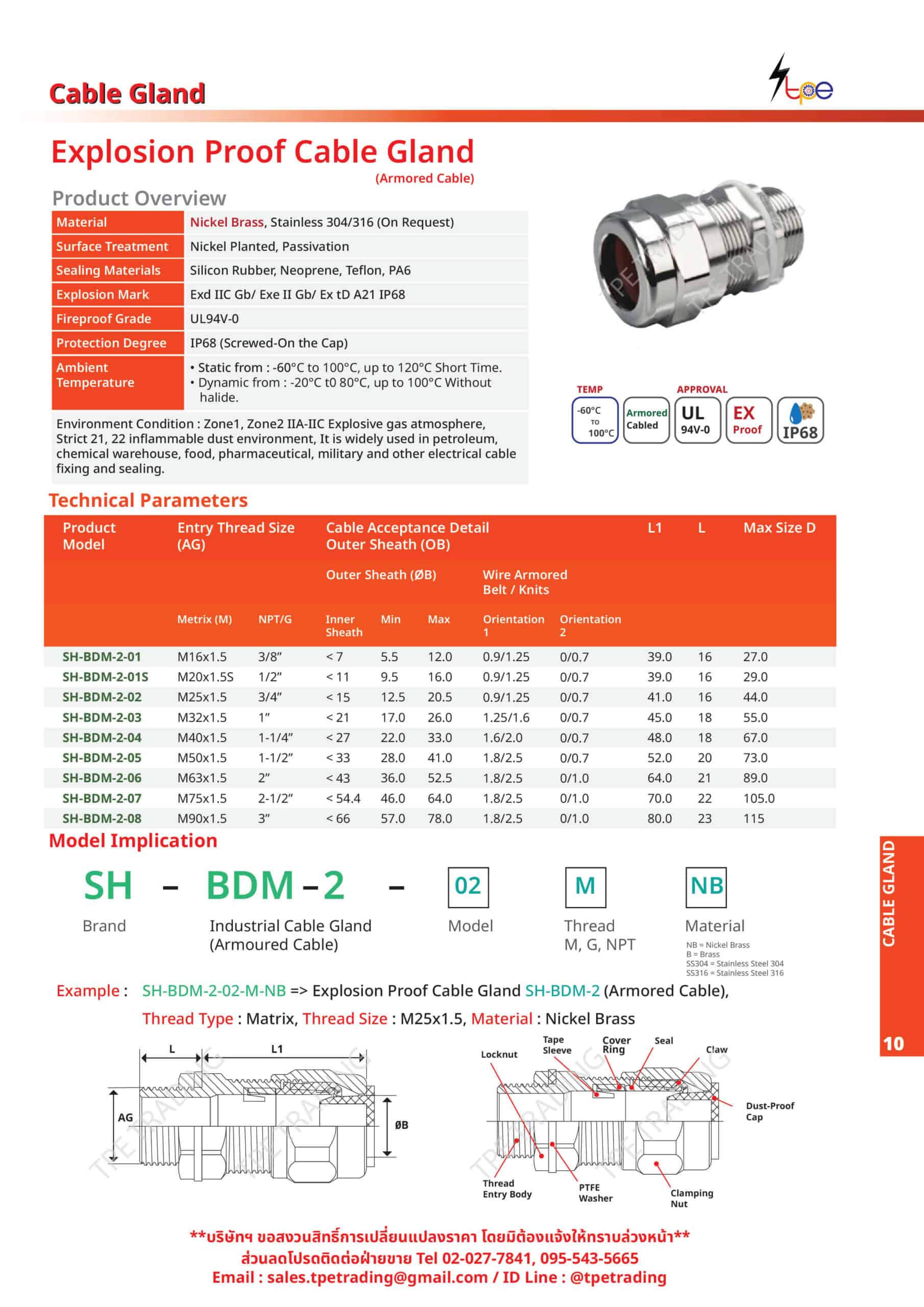 ตัวอย่าง SH-BDM-1-02MNB = เคเบิ้ลแกลนกันระเบิดสำหรับ Non-Armoured Cable รุ่น 02 ใช้สำหรับเกลียวชนิด Matrix มีขนาดเกลียว M25x1.5 ใช้วัสดุ ทองเหลืองชุบนิกเกิล