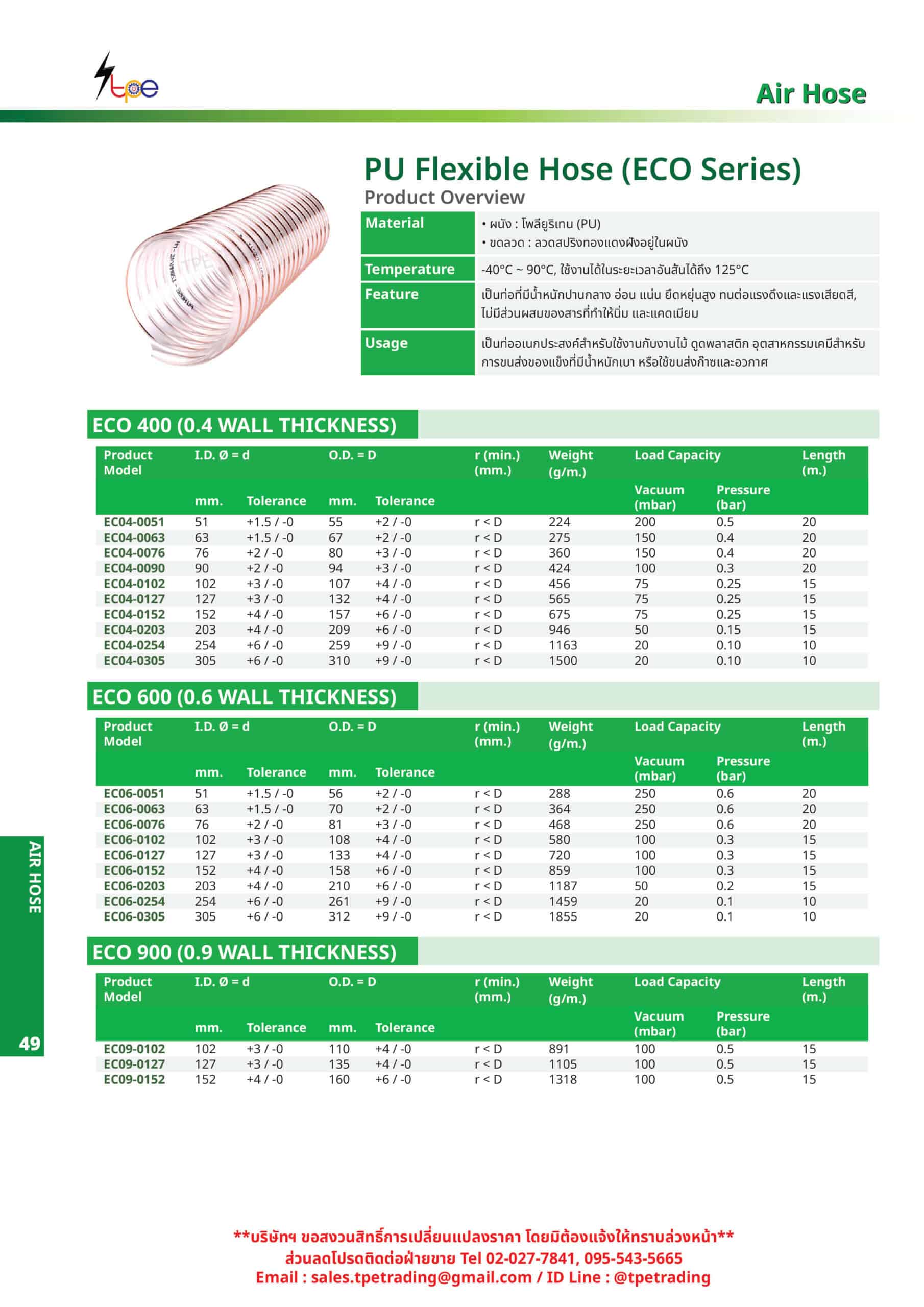 ท่อ PU (400/600/900) C ECO เป็นท่อลมชนิดหนึ่งที่มีคุณสมบัติที่ดี น้ำหนักเบา ยืดหยุ่น สามารถดัดโค้งงอได้ ผลิตจากพลาสติกชนิด โพลียูริเทน ซึ่งทนต่อแรงดึง แรงเสียดสี ท่อชนิดนี้สามารถนำมาใช้งานได้อย่างหลากหลาย ทั้งในด้านการดูดของแข็ง เช่น งานไม้ ฝุ่น หรือของแข็งที่มีน้ำหนักไม่มาก หรือจะนำมาดูดอากาศ แก๊ส ก็สามารถใช้งานได้ดีเช่นกัน